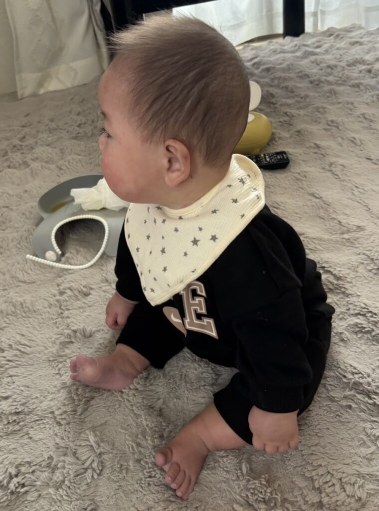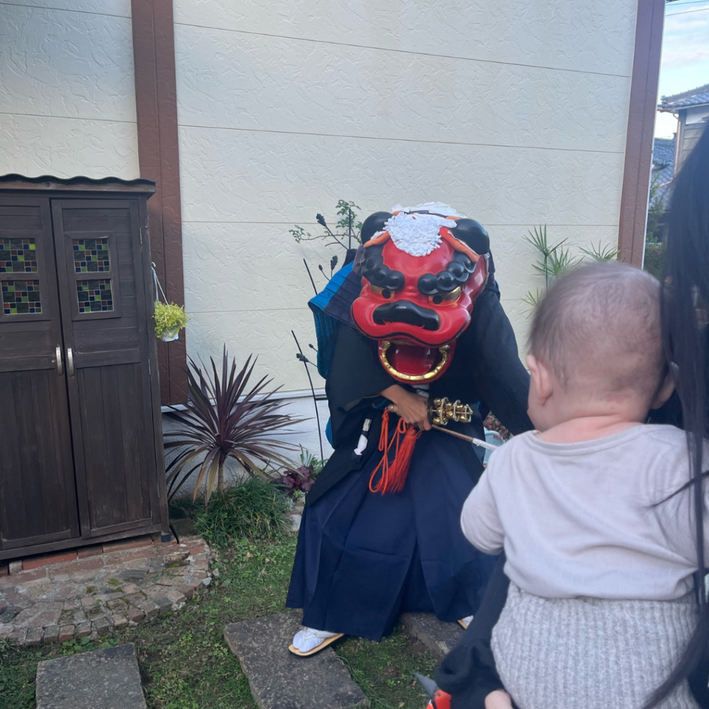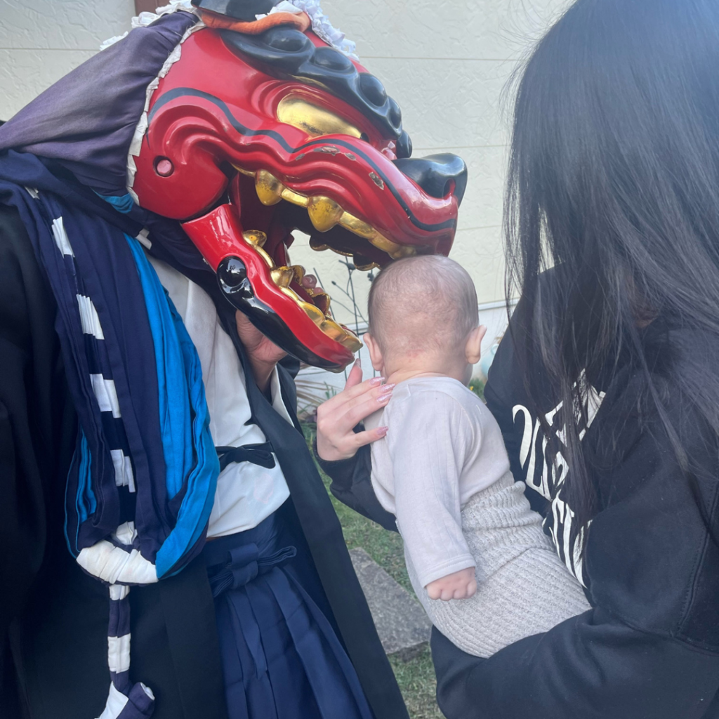 獅子舞に頭を噛んでもらうことで、邪気が払われ、健やかに成長すると言われています。この先も、病気知らずで、明るくのびのびと、健康にすくすくと育ってほしいと強く願いました。