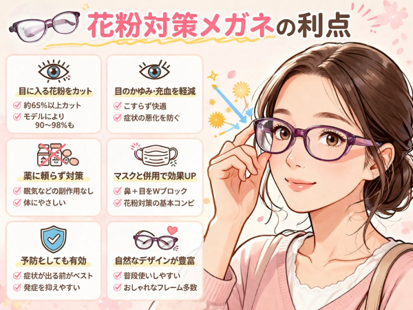 対策としては、外出時マスク着用はもちろんのこと、メガネ・花粉用ゴーグルや髪への付着を防ぐために帽子なども