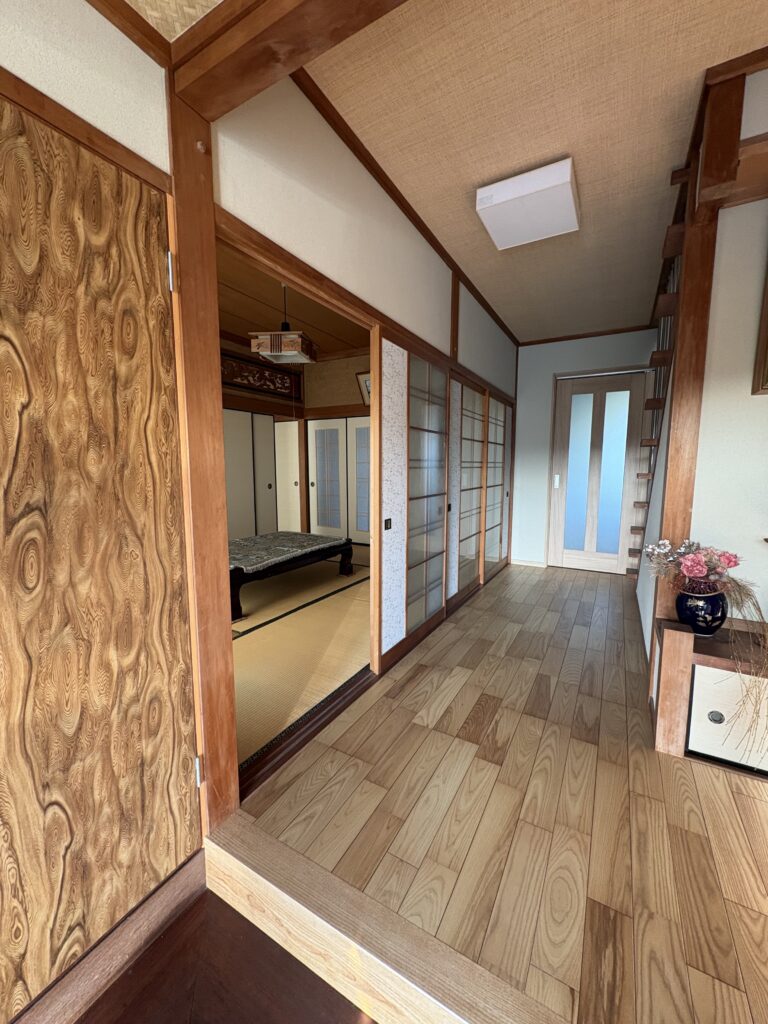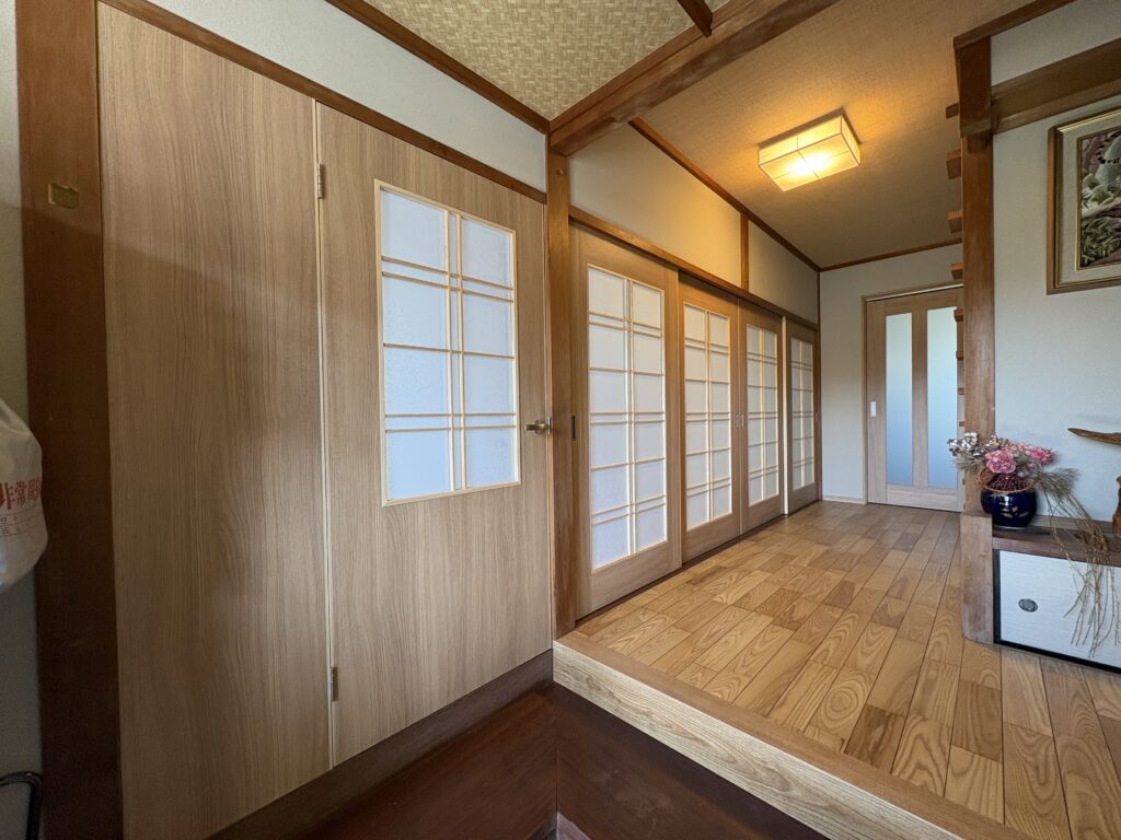 組子入りのフラッシュ戸で、廊下側は木目プリント合板、和室側は襖貼りの戸襖で納めました。