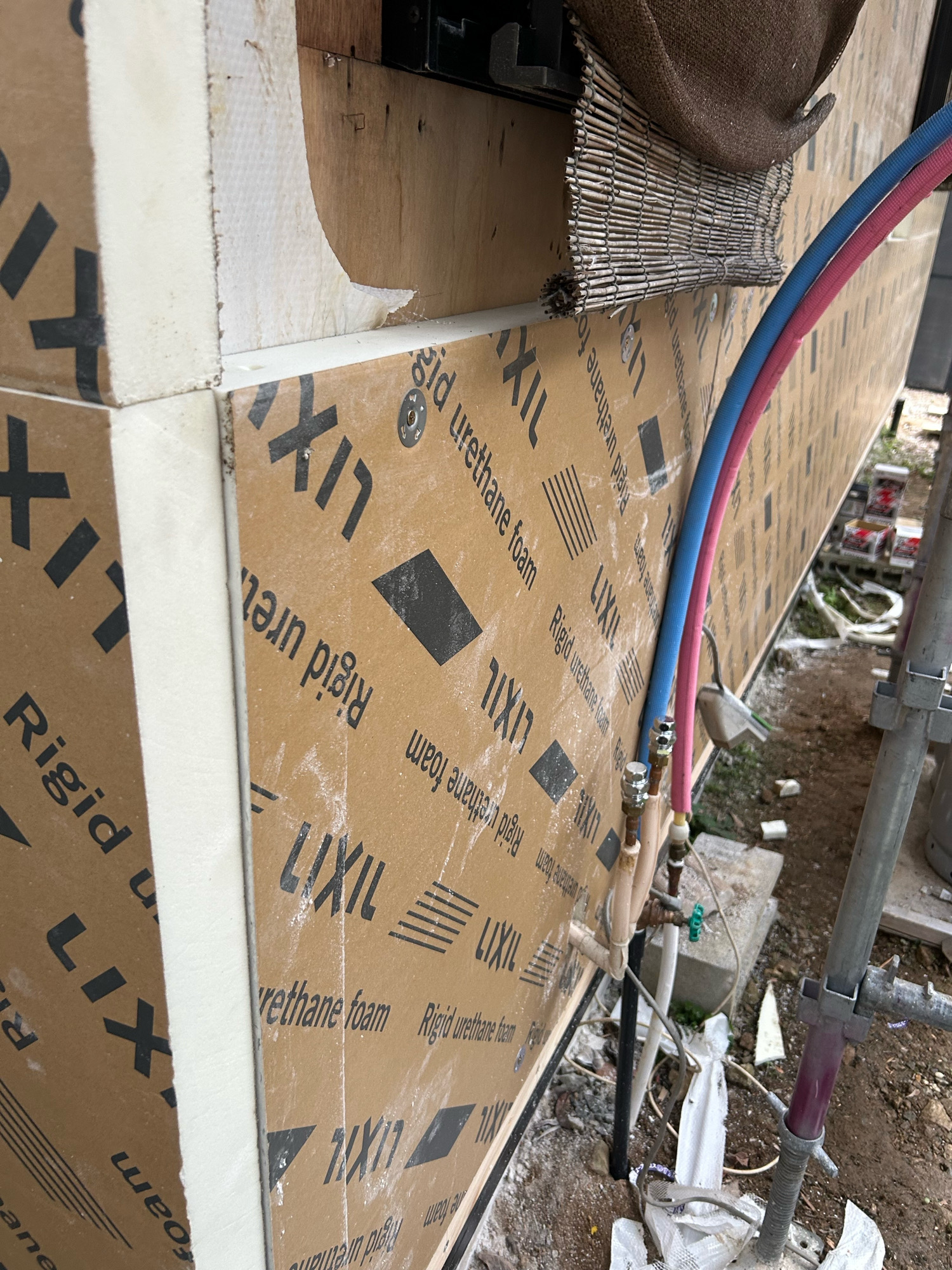 今回ご紹介する現場は「外張り」という、家全体を屋外から断熱材で覆い込む工事です。