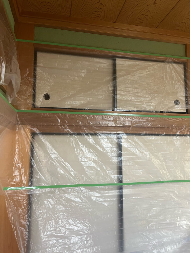 薬剤が他の場所につかないよう、畳や柱、家具をシートで隙間なく覆います。 私たちモリリフォームは、もともと建具(ドアや障子)のプロ。和室を知り尽くしているからこそ、この準備には一切妥協しません!