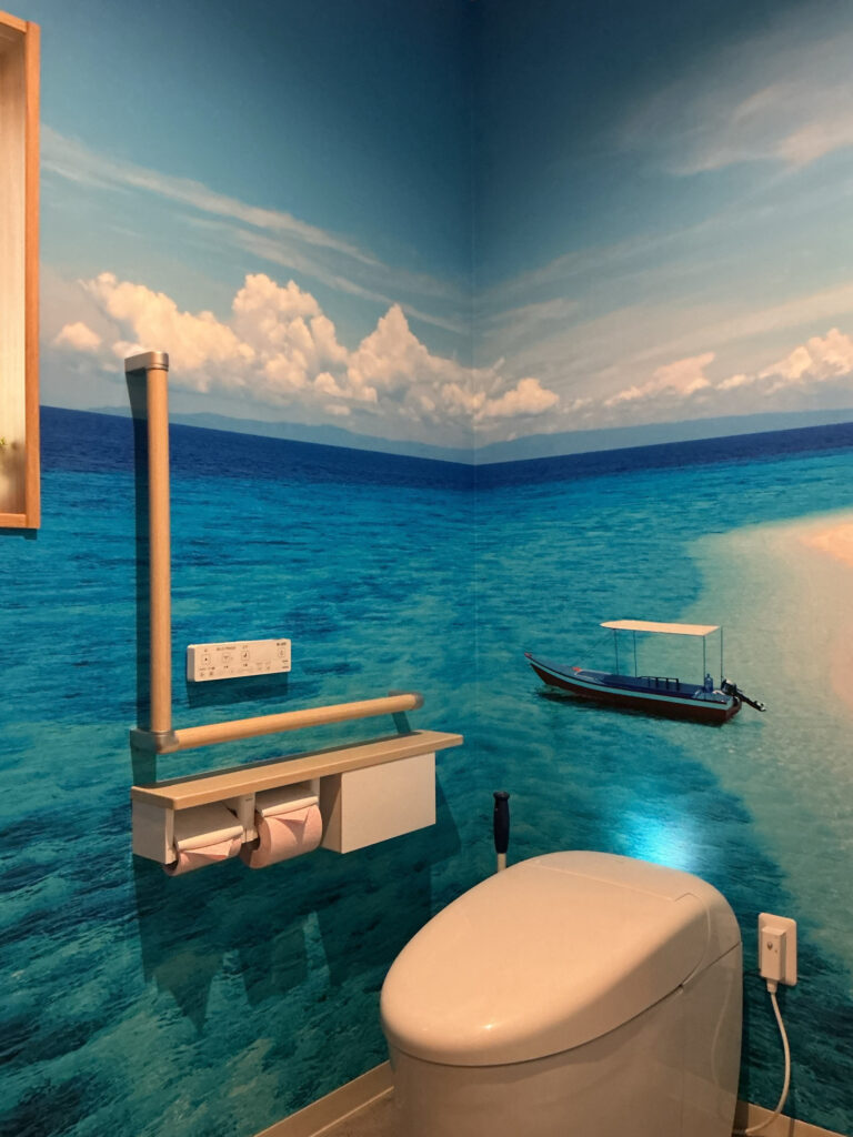 そして、何より目を引くのが壁一面の「青い海」! サンゲツのデジタルプリントクロスを使って、トイレを「プライベート・オーシャン」へと変身させました。