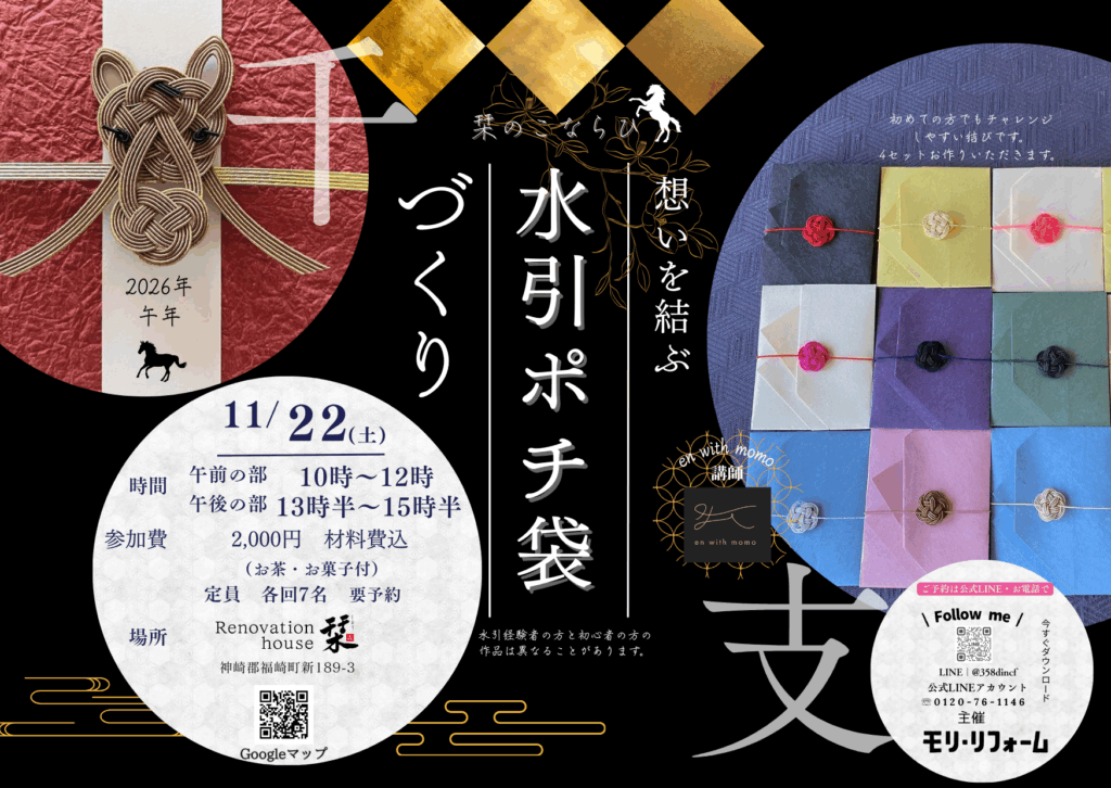 年末が近づき、お正月を迎える準備を始める時期になりましたね。 今回は、モリリフォームの「栞のこならひ」から、手作りの温かさが伝わるイベントのお知らせです!