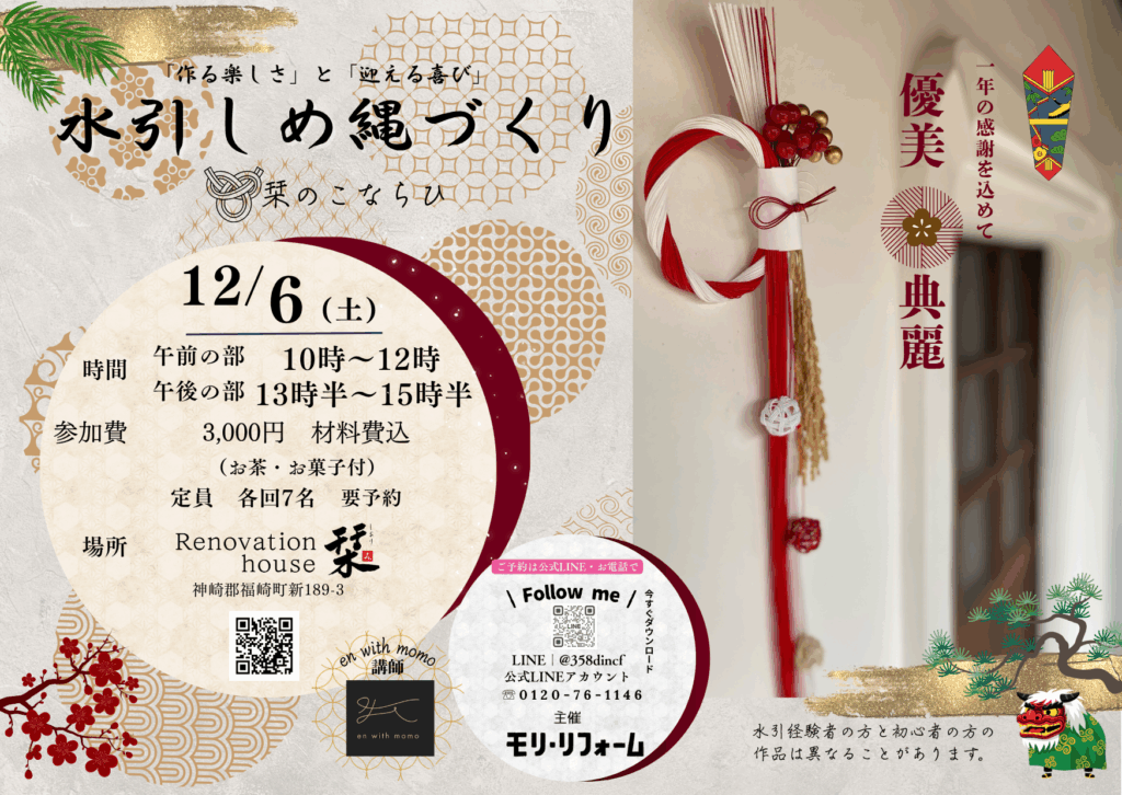 水引には、人と人とのご縁や、一年の願いをしっかりと結びつけるという意味が込められています。モリリフォームの古民家「栞」の心落ち着く空間で、この一年への感謝新年を迎える清々しい気持ちを込めて、優雅な水引でオリジナルしめ縄を作りましょう。