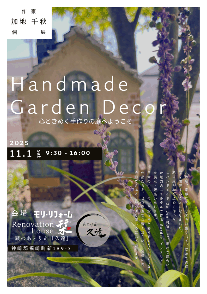 【11月1日㈯】加地千秋 初個展「ハンドメイド Garden 雑貨とモルタルインテリア展」のお知らせ