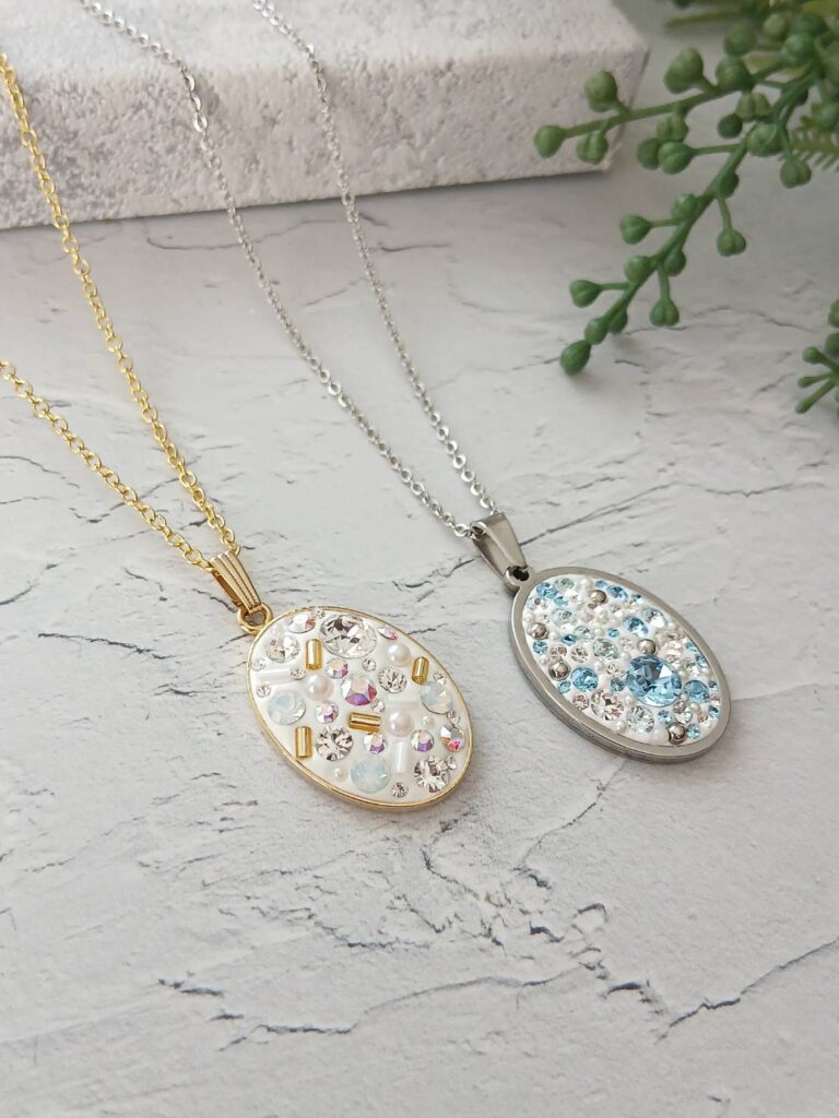 「こねて、のせて、輝かせる。」 特殊な粘土を土台にして、スワロフスキー・クリスタルを自由に乗せていく手法。難しい技術がなくても、驚くほどクオリティの高いネックレスが仕上がります。
