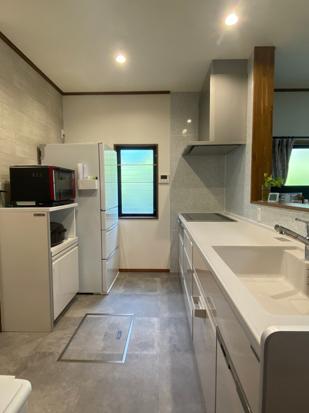 敢えて、フロアではなく石目柄を施工して、真っ白な清潔なキッチンをもっと引き立てました。