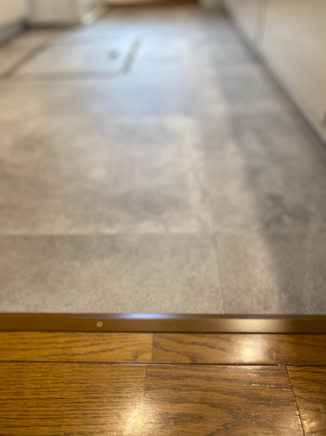 キッチン部には、重歩行用フロアを施工。薄くて段差が起こりにくく、そしてタフな素材。